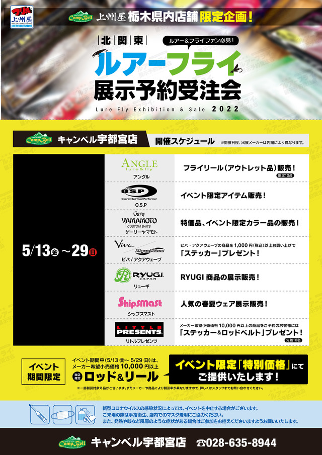 2022年5月13日セール・イベント 週末20~22日のイベントはこちら!! 週末20~22日のイベントはこちら!!週末も目白押しのイベントとなっております!新製品やガチャ・オリジナルカラーの販売もありますので、お楽しみに!皆様のご来店、お待ちしております! 出典: 上州屋からのお知らせ ・会員証機能を搭載!お買い物や釣りの準備がもっと便利になる上州屋“公式”アプリ登場!・【上州屋メンバーズカード】毎月5の付く日と30日(5日、15日、25日、30日)はポイントアップデー!