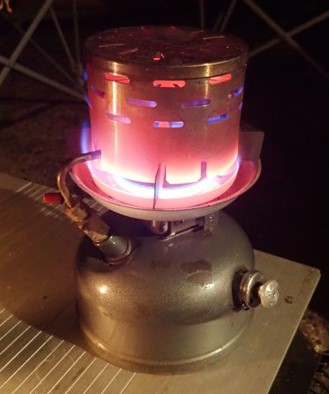 真っ赤になったヒーターアタッチメントと、隙間から漏れる炎を見てるだけでも心も体も暖かくしてくれる組み合わせのヒーター