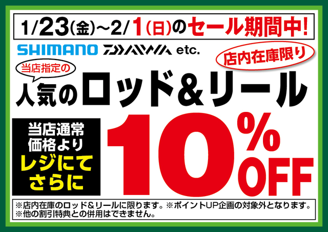1月23日(金)~2月1日(日)のセール期間中、シマノ、DAIWAなど当店指定、人気のロッド&リールが店内在庫限り、当店通常価格よりレジにてさらに10%OFF!