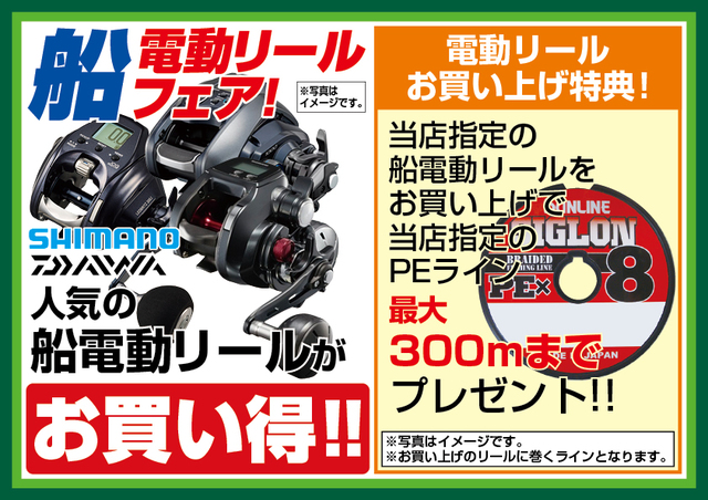 1月23日(金)からのセール期間中、シマノ、DAIWAなど当店指定、人気の船電動リールがお買い得!当店指定の船電動リールをお買い上げで、当店指定のPEライン最大300mまでプレゼント!