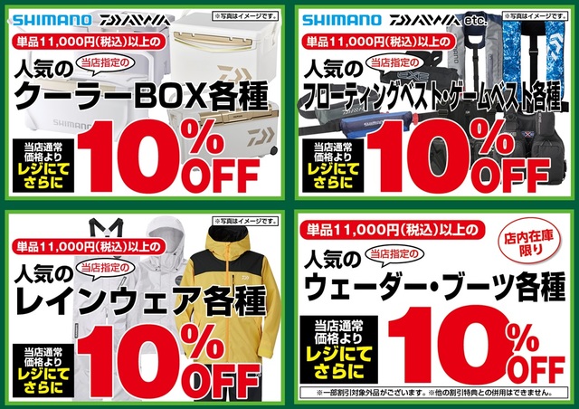 1月23日(金)からのセール期間中、シマノ、DAIWAほか当店指定、単品税込11,000円以上の「クーラーボックス各種」「フローティングベスト・ゲームベスト各種」「レインウェア各種」「ウェーダー・ブーツ各種」が当店通常価格よりレジにてさらに10%OFF!