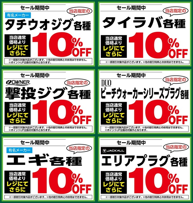 1月23日(金)からのセール期間中、当店指定の「タチウオジグ各種」「タイラバ各種」「OWNER撃投ジグ各種」「DUOビーチウォーカーシリーズプラグ各種」「エギ各種」「JACKALLエリアプラグ各種」が、店内在庫限り当店通常価格よりレジにてさらに10%OFF!