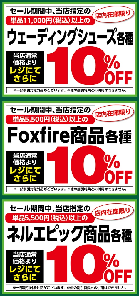 1月23日(金)からのセール期間中、当店指定の単品税込11,000円以上のウェーディングシューズ各種および、当店指定の単品税込5,500円以上のFoxfire商品各種、ネルエピック製品各種が、店内在庫限り当店通常価格よりレジにてさらに10%OFF!