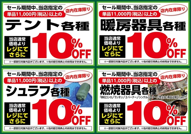 1月23日(金)からのセール期間中、当店指定、単品税込11,000円以上の「テント各種」「暖房器具各種」「シュラフ各種」「BBQコンロ、ランタン、2バーナー、シングルバーナー、焚火台(用品は除く)などの燃焼器具各種」が当店通常価格よりレジにてさらに10%OFF!