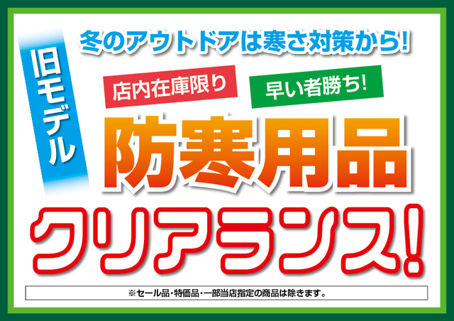 冬のアウトドアは寒さ対策から!店内在庫限り、早い者勝ち!旧モデル防寒用品クリアランス開催!