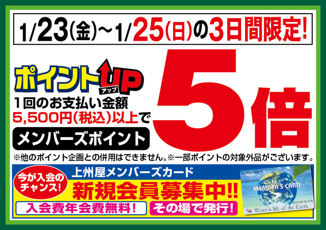1月23日(金)、24日(土)、25日(日)の3日間限定、店内税込5,500円以上お買い上げで、メンバーズポイント5倍!