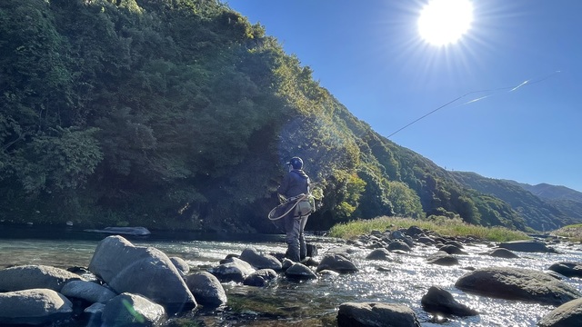 水辺へ降りると午前中から釣りをしていた当店スタッフの瀬戸がフライロッドを振っていました。