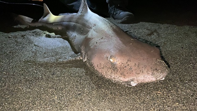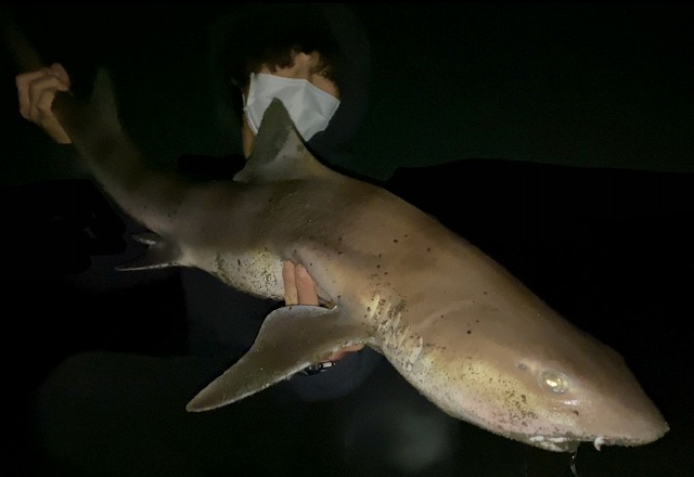 ドチザメはサメ類の中では比較的おとなしい性格であり、人を襲うことなどはないですが、釣り上げた後はそれなりに暴れます。数年前、一晩で10匹以上のドチザメを釣った日があり、横着して適当につかんだら脇腹を思い切り噛まれました(笑)かなり痛かったし、血も出た上にしばらく跡が消えなかったので衣類をまとっていない状態で腕などをかまれたら結構な怪我につながると思います。取り込み中や針ハズシ中、リリース時には要注意です。