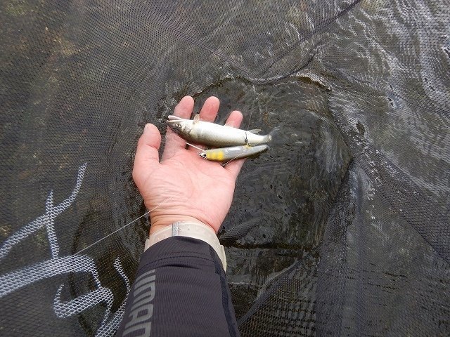 時間的なものなのか、瀬の流心では反応なく、瀬肩やブロックの基礎部分・平瀬でポツポツ掛かります。