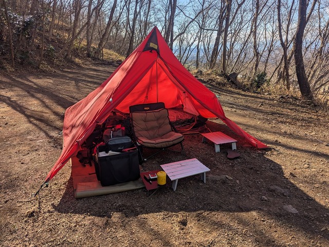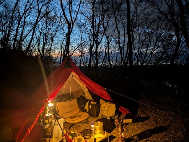 暴風にもまれまくって笑。簡単な装備ですが、テントを張るだけで1時間!この時で風葬7m。夕日や夜景などをみながらキャンプしたかったのですが、熱海方面からの風が吹きっぱなしで(ノД`)...今回はあえての「絶景に背負向けて」スタイルで。