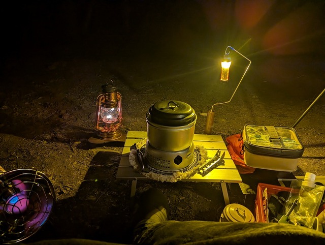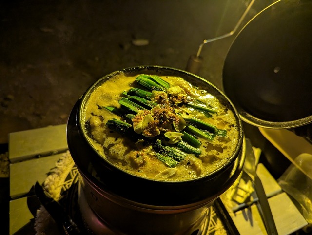 この日は「もつ鍋」!(どうせ誰にも会わんし)ということで、にんにくとニラは多め!〆はもちろんラーメンでしょ(^^♪グッツグツに煮込めて、ストームクッカーの威力に驚愕!ガスバーナーだったらこうはいかなかったとおもいます。
