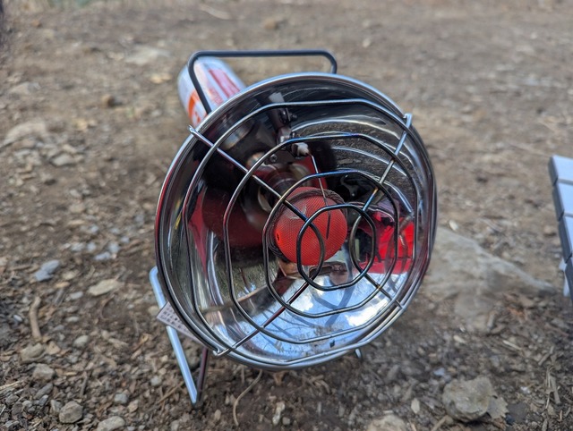 整体から戻る頃には気温は1℃。風もとても強いので、体感はマイナスいってます!早速出番の「アウトドアヒーター」焚き火もできないので、今回はこれが頼りです。