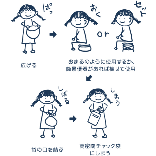 においや内容物をもらさない超防臭チャック袋付き、1回分がセットになった携帯トイレです。