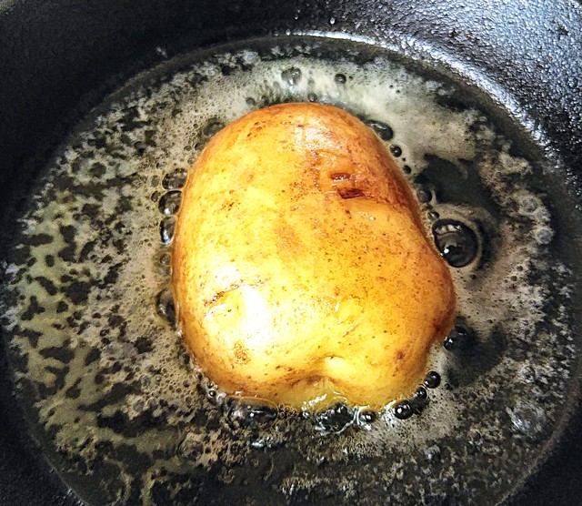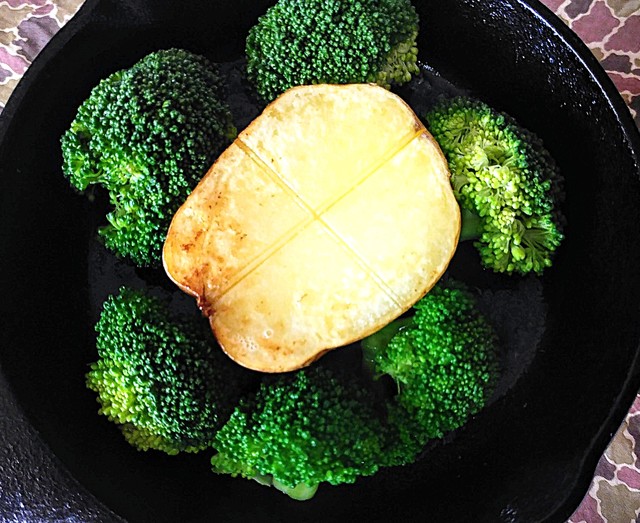 バターなどで軽く炒めブロッコリー、少量のお酒を入れてスキレット内に敷き詰め蓋をしてジャガイモ/ブロッコリーを蒸し焼きに。