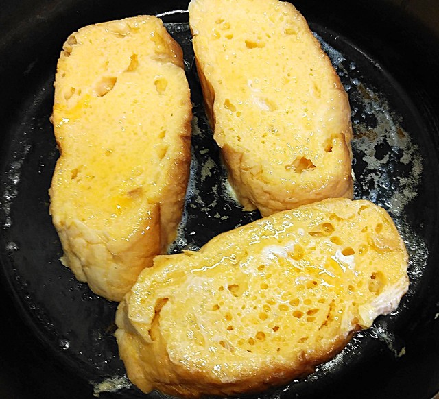 ①卵に牛乳約100cc砂糖(少量)を加えパンを漬け込みます バターを入れ弱火で焦がさないように両面焼いていきます。