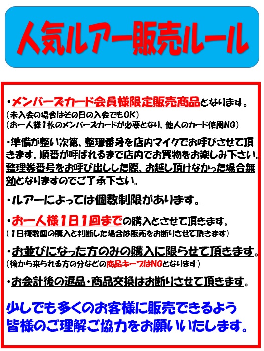 人気ルアー販売時は整理券を配布する予定です。