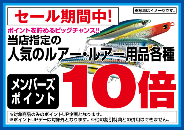 店内在庫のルアーとルアー用品のお買上でメンバーズカードポイントが10倍に!