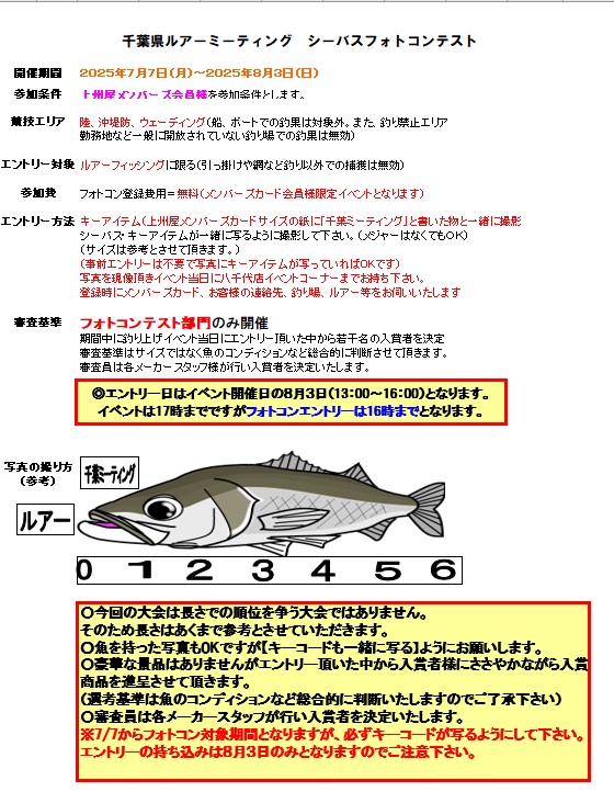 ・期間内に釣り上げたシーバス・ルアー・キーコード(千葉ミーティング)の3点が写るように撮影して下さい。