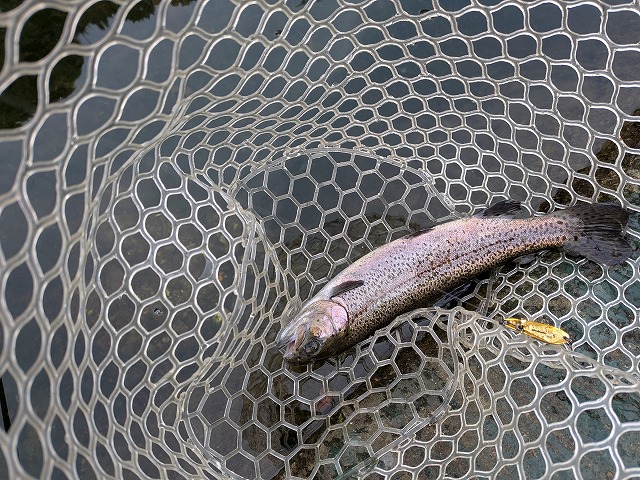 今回は山武市にある管理釣り場「釣りパラダイス」にトラウト狙いで釣りに行ってきました。水質はとてもクリアで魚見えるほどです。まずは定番のフォレスト「MIU1.4g」をボトム付近から表層付近まで探りましただが反応は厳しい…「カルテラス ウルキ40」に替えボトムを藻を避けながらやっとニジマスをゲット!予習してきたキャスト着底後ステイ&1/6デジ巻きでの狙い方が一番反応がよかったです。