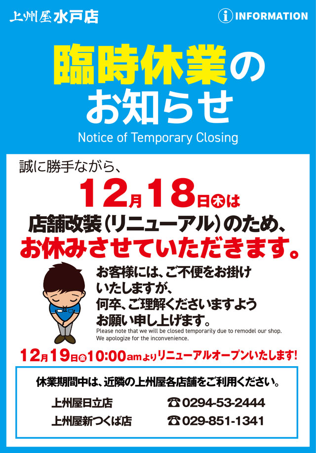 誠に勝手ながら12月18日(木)は、店内改装の為、臨時休業させて頂きます