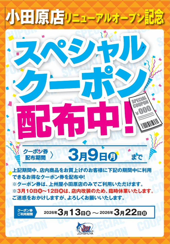 只今、上州屋小田原店ではリニューアルオープン記念企画として、店内商品お買い上げのお客様に小田原店のリニューアルオープンから(3月13日~3月22日)ご利用いただけるスペシャルクーポンを配布中(≧◇≦)b