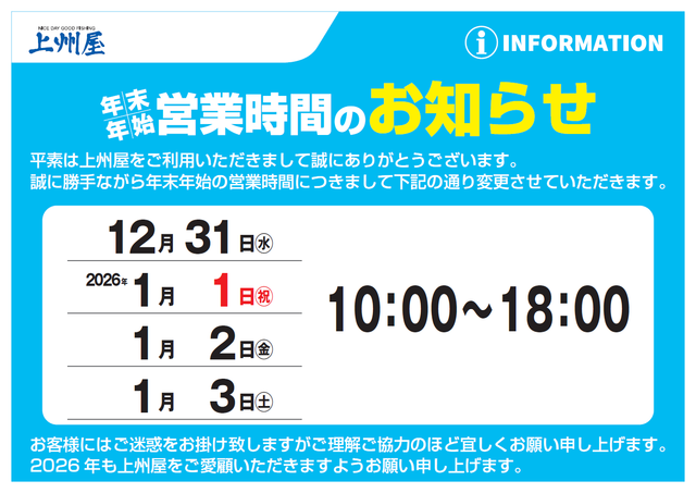 〔1/1(元旦)~1/12(月/祝)〕2026上州屋初売…