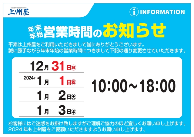 年末年始の営業時間のお知らせ