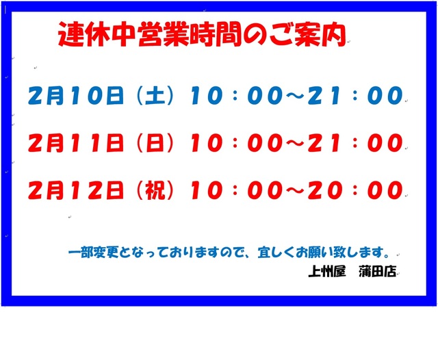 連休中の営業時間のお知らせ。