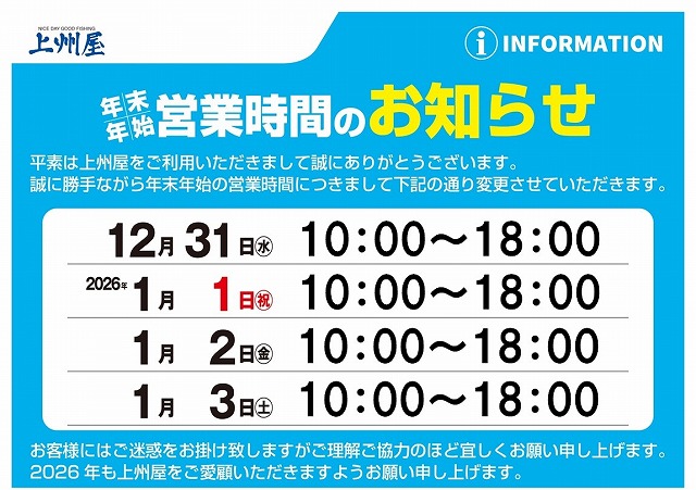 年末年始 営業時間のご案内