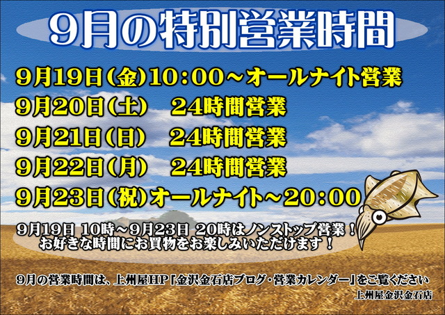 週末オールナイト営業 実施中! 9月23日(火)20…