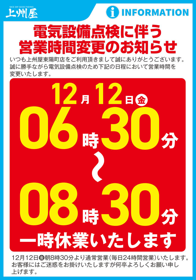 棚卸に伴う 営業時間変更のお知らせ