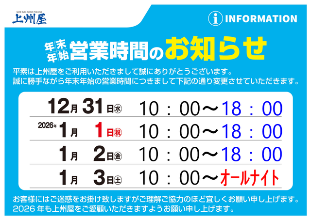 年末年始の営業時間のお知らせ!