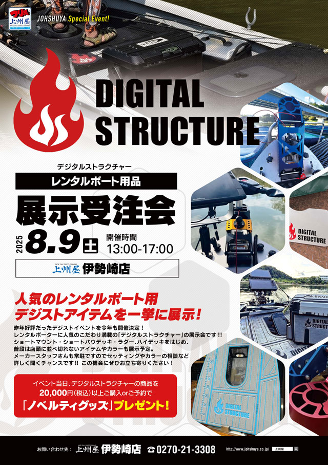 2025年8月9日(土)13:00~17:00、上州屋伊勢崎店にてバス用レンタルボートのお悩み解決!デジタルストラクチャー展示受注会を開催します!