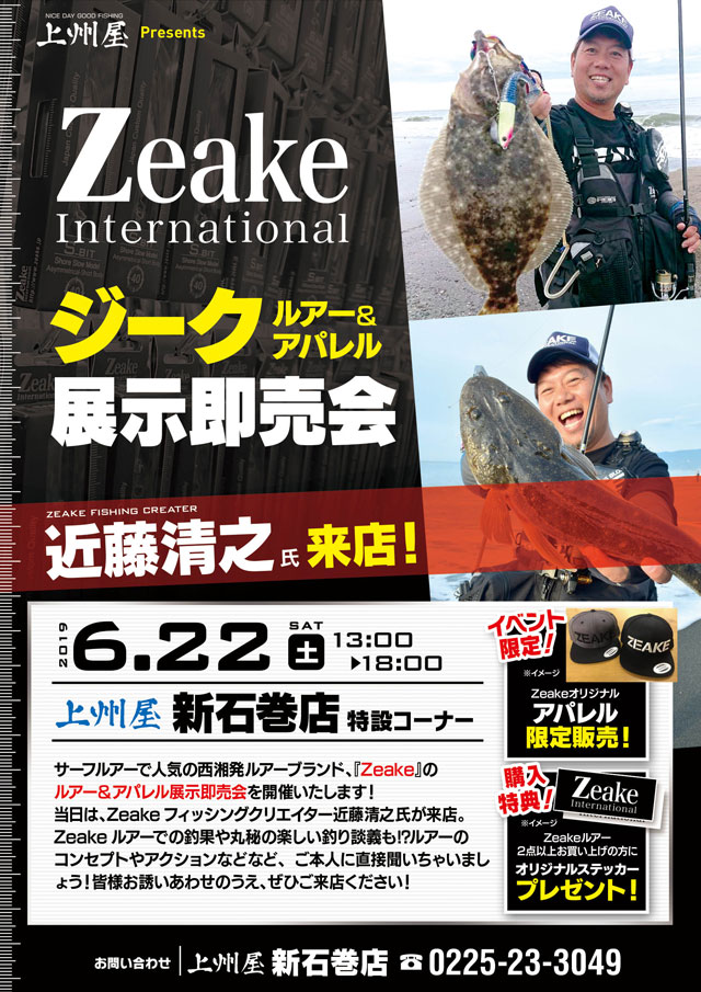 2019年6月22日(土)13:00~18:00、上州屋新石巻店にてZeake(ジーク)ルアー&アパレル展示即売会を開催します!