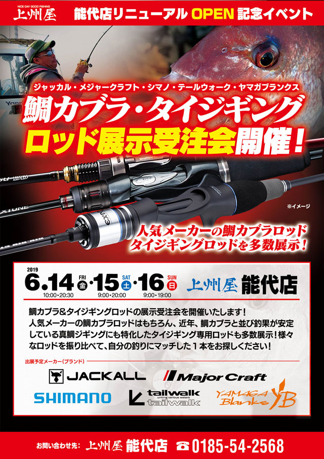 2019年6月14日(金)15日(土)16日(日)の3日間、鯛カブラ・鯛ジギングロッド展示受注会を開催!ジャッカル・メジャークラフト・シマノ・テイルウォーク・ヤマガブランクスなど人気メーカーのロッドを多数店頭展示します!様々なロッドを見て触って自分の釣りにマッチした一本を探していただけるまたとない機会です!