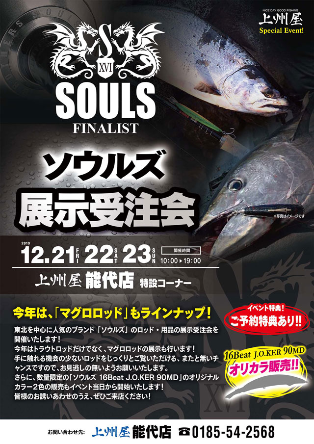 2019年12月21日(金)、22日(土)、23日(日)の3日間、上州屋能代店にて東北を中心に人気のブランド「ソウルズ」のロッド・用品、展示受注会を開催します!今年はトラウトロッドだけではなくマグロロッドも展示!手に触れる機会の少ない貴重なロッドをじっくりとご覧頂けるまたとないチャンスです!