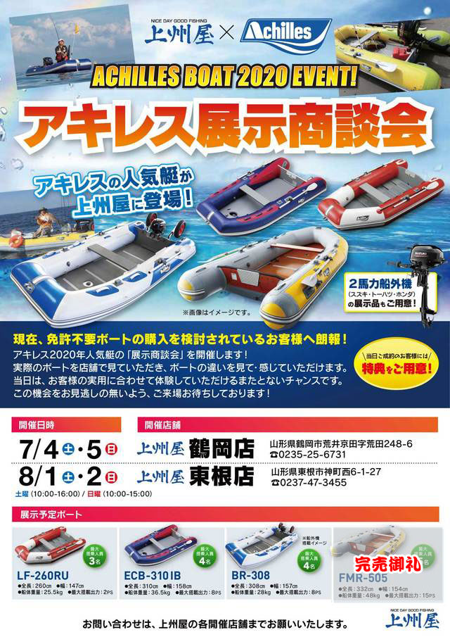 2020年8月1日(土)10:00~16:00および8月2日(日)10:00~15:00の2日間、上州屋東根店にてアキレス2020免許不要ボートの店頭展示を行います。