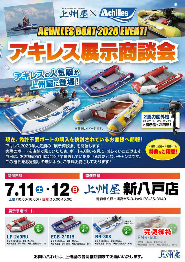 2020年7月11日(10:00~16:00および7月12日(10:00~15:00の2日間、上州屋新八戸店にてアキレス2020免許不要ボートの店頭展示を行います。