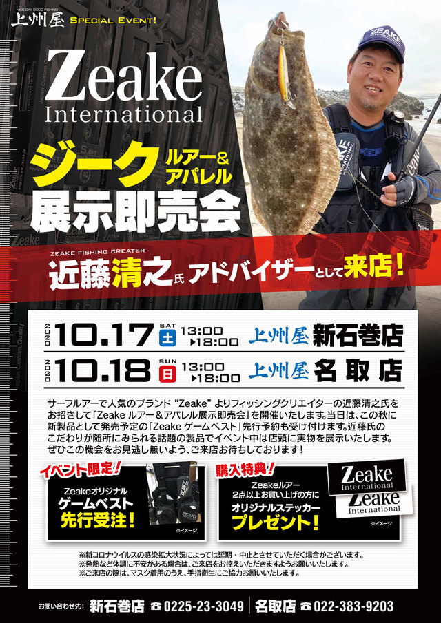 当日はZeake(ジーク)フィッシングクリエイター近藤清之さんが来店予定!新製品「Gスラッシャー」や人気製品「Rサーディン」「Sビット」の使い方、製品コンセプトなど気になる事柄をご本人に直接聞ける他、この秋発売予定の「Zeakeゲームベスト」を実物展示して先行予約も受け付けます!