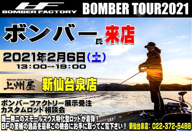 2021年2月6日(土)13:00~19:00(予定)、上州屋新仙台泉店に桧原湖カリスマガイド“ボンバーさん”が来店!ボンバーファクトリーロッドの展示受注&カスタムロッド相談会を開催します!