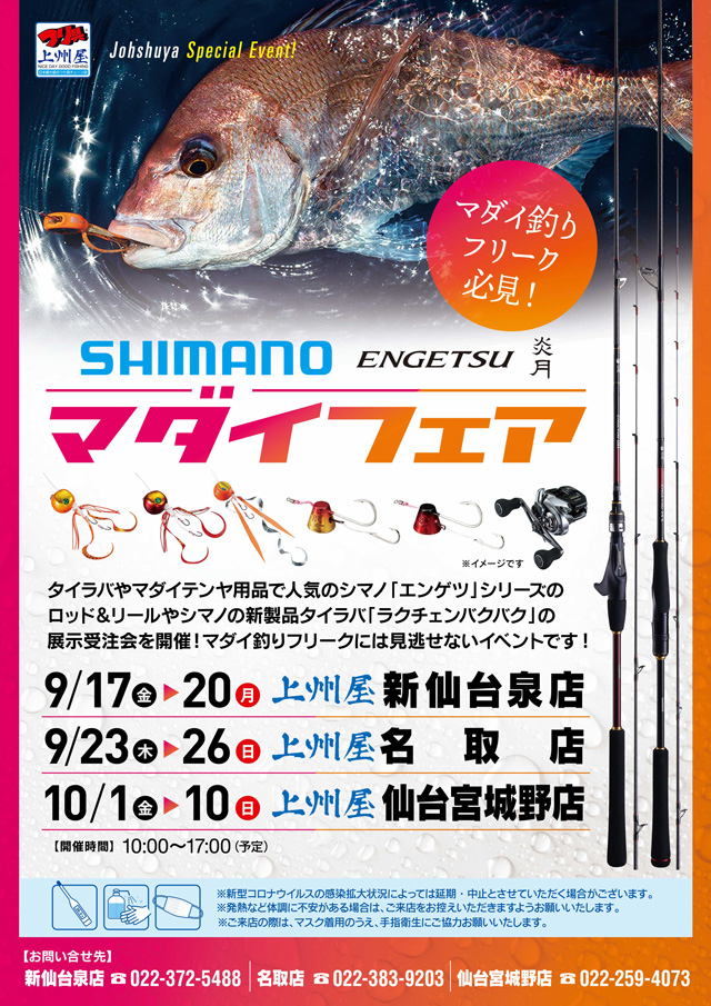 2021年9月17日(金)~20日(月/祝)の4日間、上州屋新仙台泉店にてシマノ炎月“マダイフェア”展示受注会を開催します!