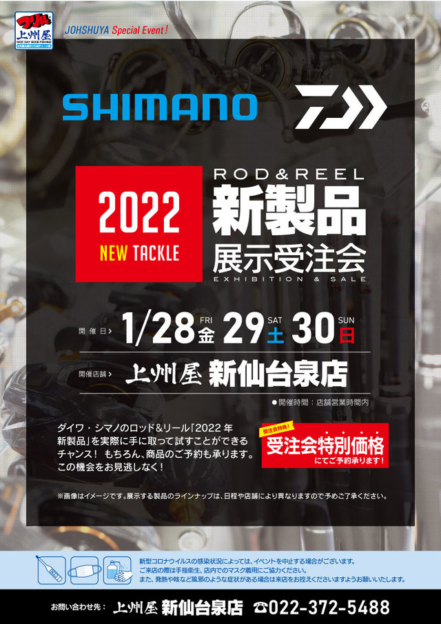 2022年1月28日(金)、29日(土)、30日(日)の3日間、上州屋新仙台泉店にてシマノ・ダイワ2022年ロッド&リール新製品の展示受注会を開催します!(※ダイワ製品はリール展示はなく、ロッド展示のみとなります。)