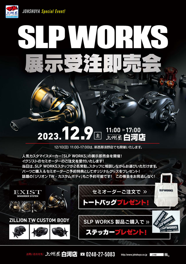 2023年12月9日(11:00~17:00、上州屋白河店にてSLP WORKS(エスエルピーワークス)カスタムリール&パーツの展示注&売会を開催します!