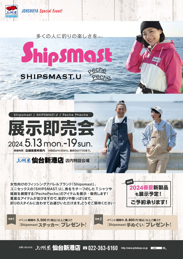2024年5月13日(月)14:00~5月19日(17:00の約7日間、上州屋仙台新港店にて女性アングラーに人気のフィッシングウェアブランド、Shipsmast(シップスマスト)展示即売を開催します!