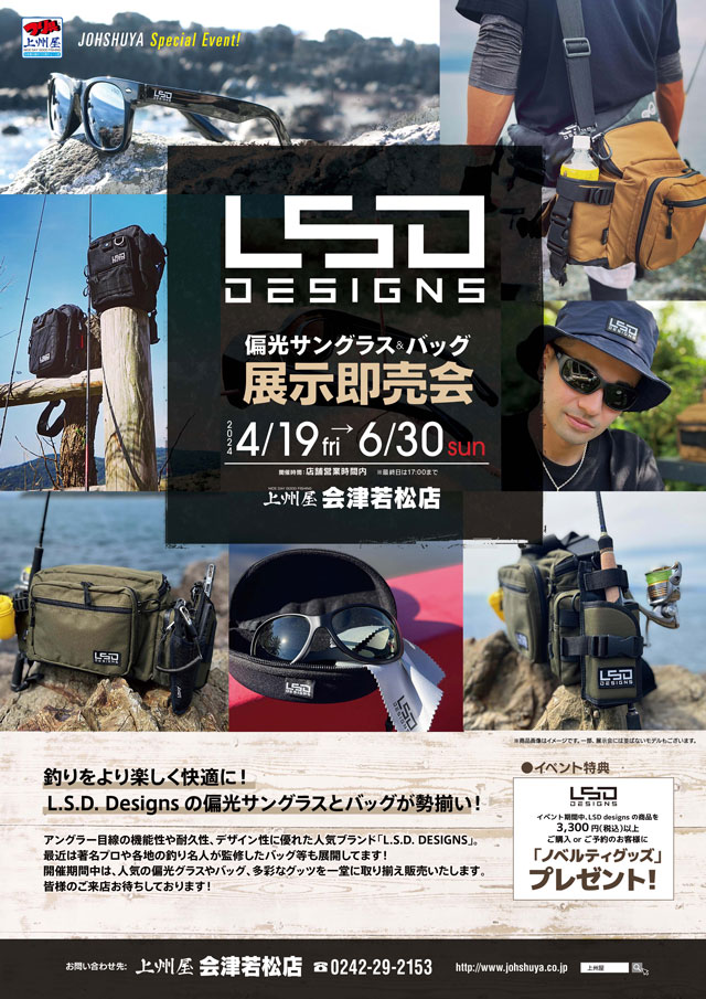 2024年4月19日(金)~6月30日(日)の期間中、上州屋会津若松店にてLSDデザインズの、偏光グラス&フィッシングバック展示即売会を開催します!