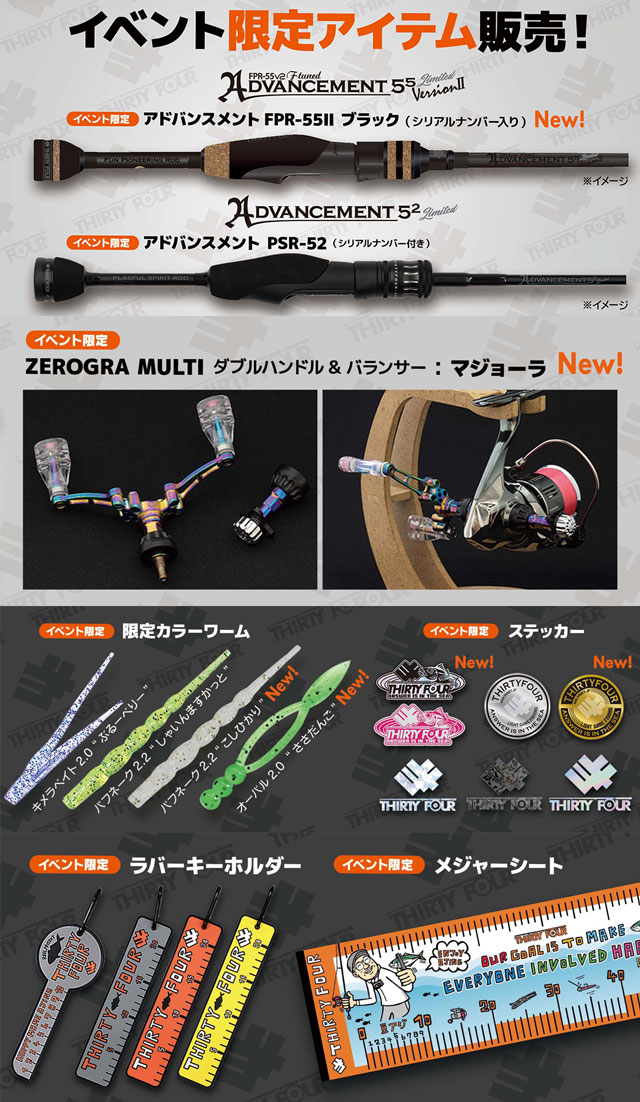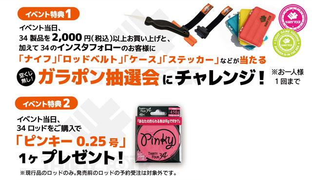 今回イベントにて34対象製品を2,000円(税込)以上お買い上げの上、34のInstagramをフォローいただくと、ナイフ、ロッドベルト、ケース、ステッカーetc.が当たる「ガラポン抽選会」にチャレンジいただけます!※お一人様1回まで