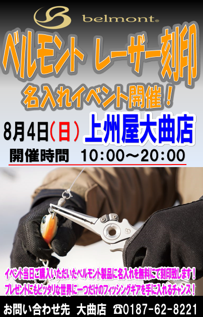 2024年8月4日(日)、上州屋大曲店にてベルモント製品レーザー刻印“名入れ”イベントを開催します!