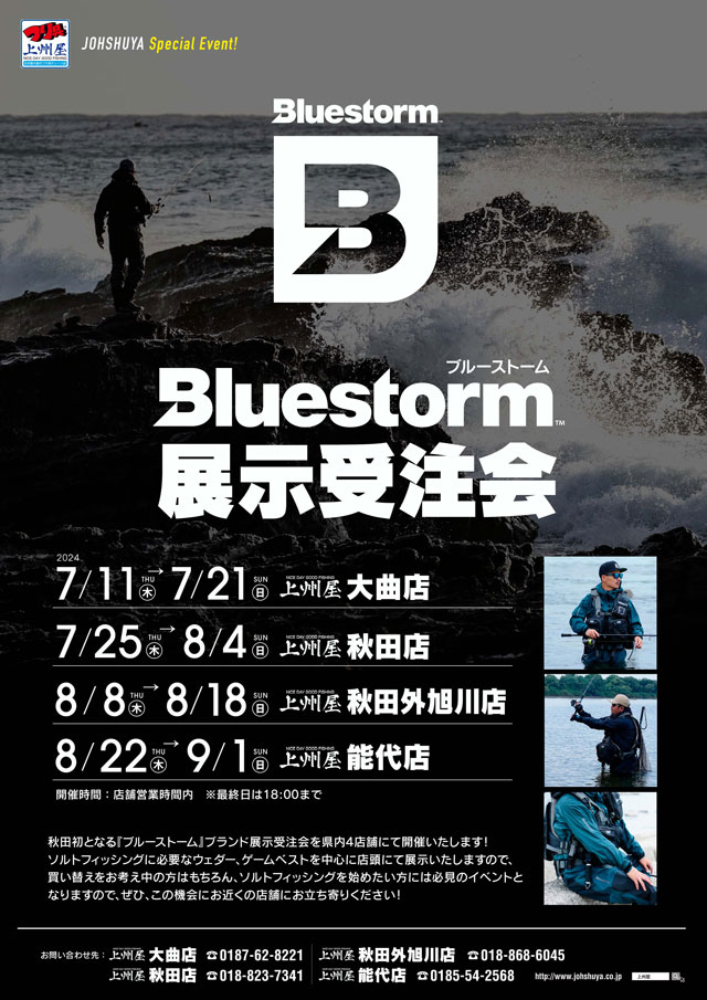 2024年7月25日(木)~8月4日(日)の11日間、上州屋秋田店にて救命胴衣メーカーとして有名な高階救命器具のルアー向けブランド、Bluestormブルーストームの展示受注会を開催します!