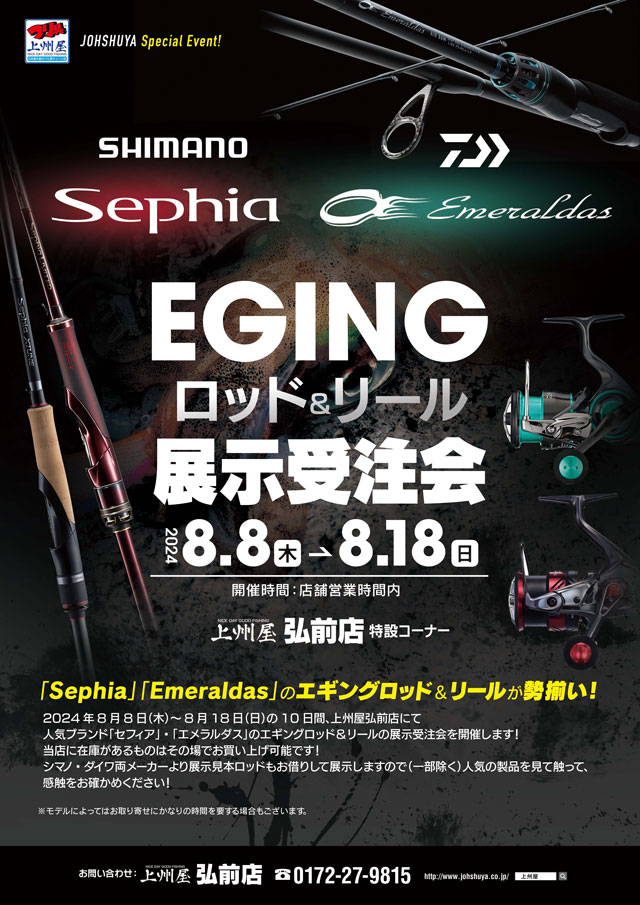 2023年8月8日(木)~18日(日)の期間中、上州屋弘前店にて人気のエギングブランド、SHIMANOセフィア&DAIWAエメラルダス、エギングロッド&リール展示受注会を開催します!
