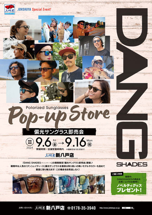 2024年9月6日(金)~16日(月/祝)の11日間、上州屋新八戸店にDANG SHADES(ダン・シェイディーズ)偏光グラスのポップアップストアが登場します!